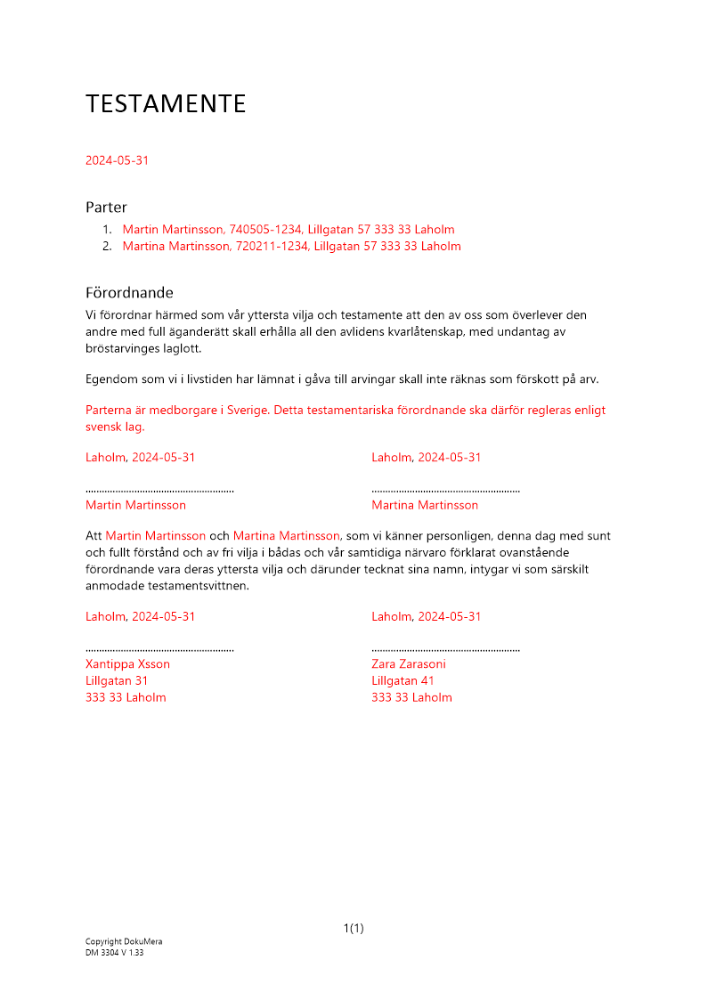 Produkter taggade med 'Testamente Inbördes makar Ärvdabalken testator bevittnat nödtestamente laglott särkullsbarn sambor'