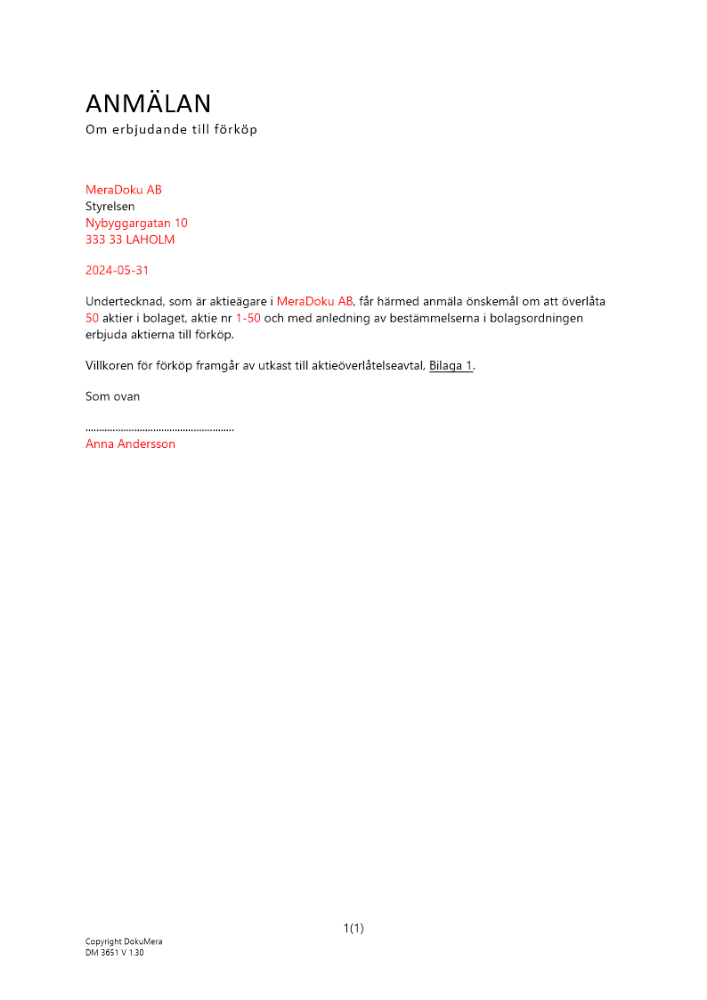 Produkter taggade med 'Förköp av aktier förköpsförbehåll förbehåll förköp anmälan aktieägare erbjudande bolagsordning aktie'