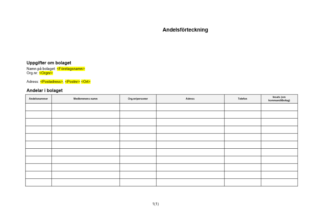 Produkter taggade med 'Andelsförteckning Andelsförteckningen uppställning andelar bostadsrättsförening företag allmän handl'