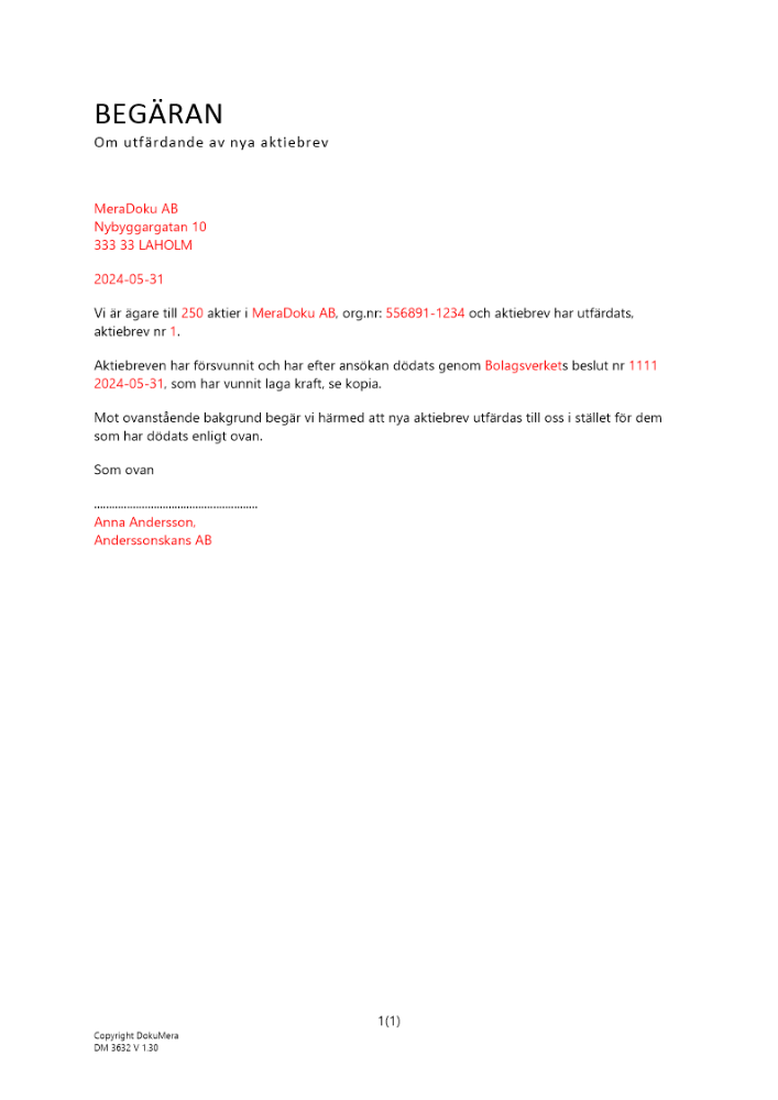 Produkter taggade med 'Aktiebrev begäran utfärdande nya aktierförkommen handling dödande tingsrätt'