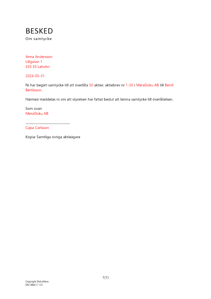 Produkter taggade med 'samtycke aktieöverlåtelse samtyckesklausul aktieägare bolagsordning aktieägaravtal styrelse aktier'