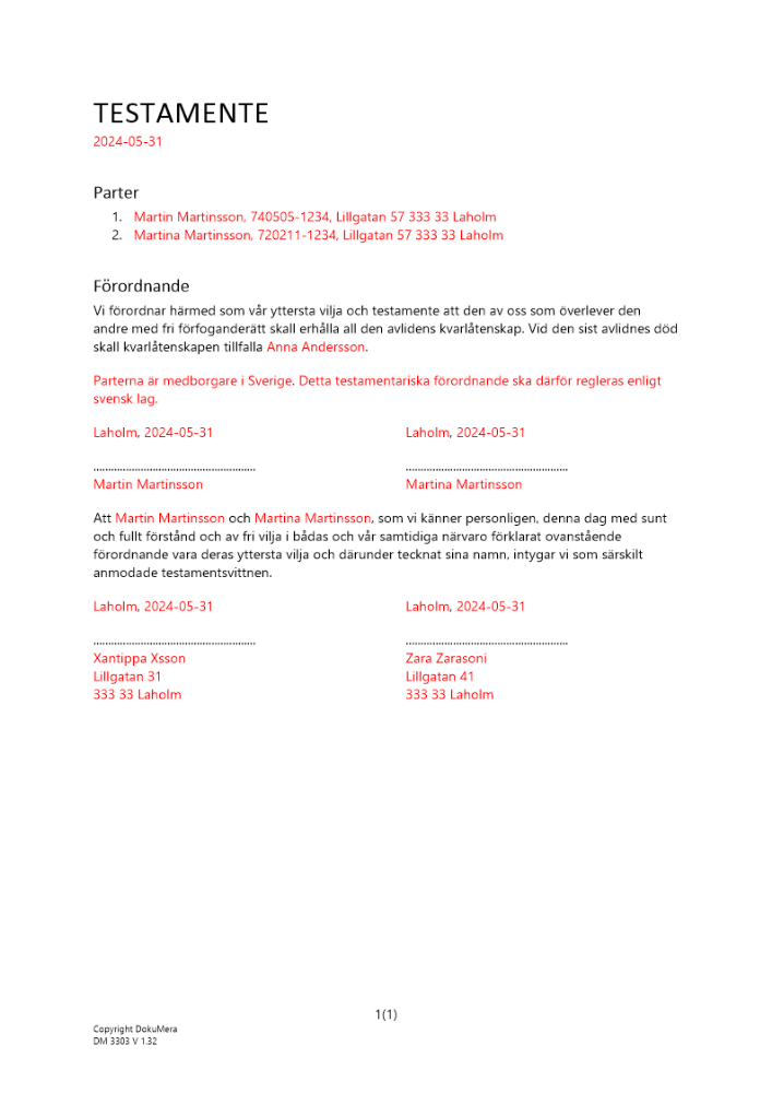 Produkter taggade med 'Testamente Inbördes makar Ärvdabalken testator vittnen nödtestamente sambor förmån förordnande'