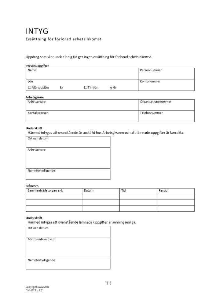 Produkter taggade med 'intyg ersättning förlorad inkomst förtroendevald förtroendeuppdrag tjänstledighet tjänstledigt'