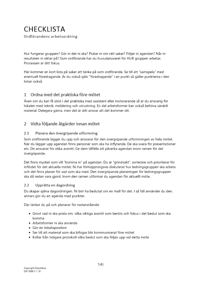 För att styrelsemötena ska bli effektiva bör det i arbetsordningen även framgå följande: - vilka olika processer och resultat som ska kontrolleras, t.ex. resultaträkning, likviditet, orderläge m.m. - mötenas uppbyggnad (fasta ärenden, löpande ärenden och temaärenden) - dagordningens utseende - förutsättningen för ett effektivt styrelsemöte är att alla är väl insatta i det som ska diskuteras och beslutas redan innan.