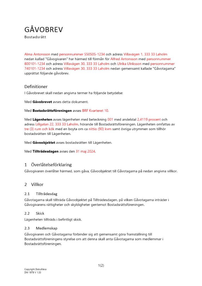 Produkter taggade med 'fastighetsgåva gåva lös egendom Gåvobrev bostadsrätt givare mottagare bostadsrättslägenhet Överlåtelse bostadsrätt lägenhet gåva'