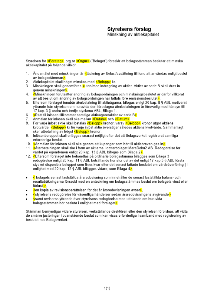 Produkter taggade med 'Styrelsen förslag minskning aktiekapital återbetalning aktieägare'