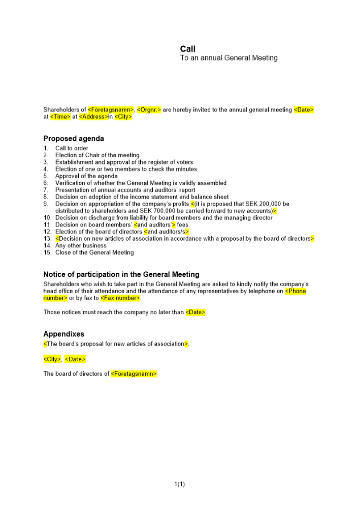 Produkter taggade med 'Kallelse årsstämma disponibla vinstmedel bolagsordning bolagsstämma arbetsordning dagordning engelsk'