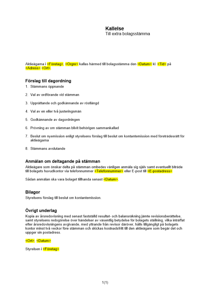 Produkter taggade med 'Kallelse extra bolagsstämma kontantemission nyemission styrelse privat aktiebolag bolagsstämmor'