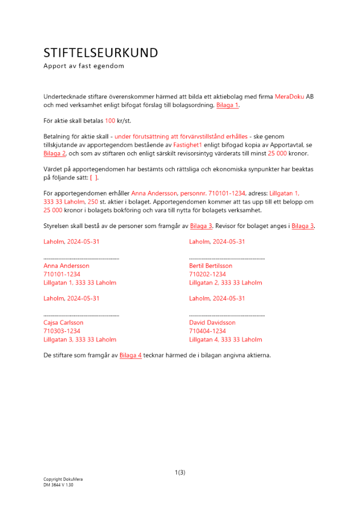 Produkter taggade med 'Stiftelseurkund apport apportegendom aktier bildande fast egendom fastighet'