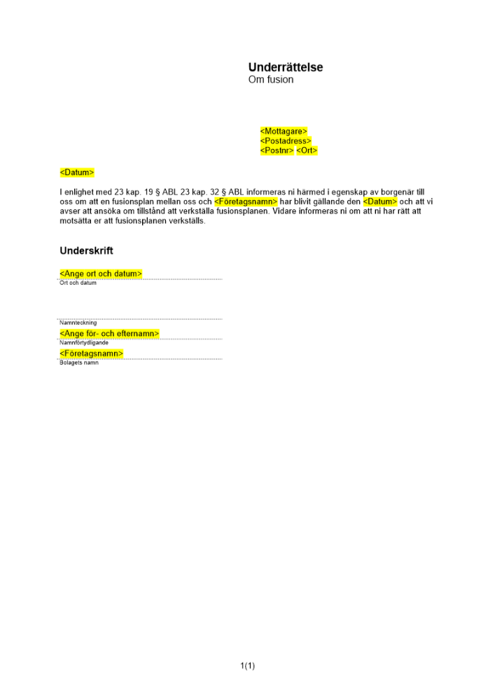 Produkter taggade med 'Underrättelse borgenärer absorption helägt dotterbolag fusion moderbolag fusionsplan ansökan'